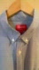 • Details: Full button-down front, classic collar, long sleeves with button cuffs, chest pocket with red logo