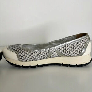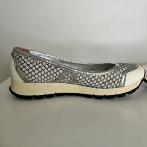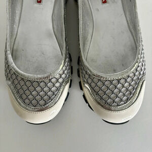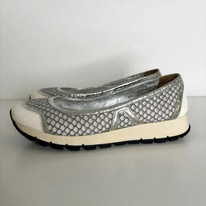 Prada Ballet Running Shoes Size : 36.5 Colors : White, silver In very good pre-owned condition, only flaw is that the silver finish is wearing off on some areas around the top of the shoes, especially near the heel. Please see all photos.