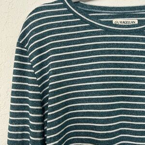 Magellan Outdoors Teal/White Striped Long Sleeve Tee. It features a classic fit with a crew neck, Long sleeve T-shirtHorizontal teal and white stripes