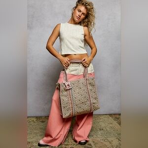 Timeless with a softly sun-worn feel, this geo patchwork tote embodies the relaxed, heirloom-inspired aesthetic POL is known for. Designed in a structured yet easy silhouette, it features an allover geometric pattern in warm golden tones, accented with contrast stitching and delicate trim details for added texture and depth.