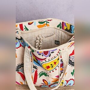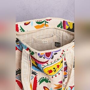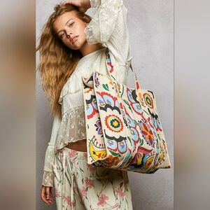 Bright, expressive, and artfully crafted, this folk-print tote brings a lively twist to the signature POL aesthetic. Designed with a softly structured silhouette, it features vibrant hand-drawn florals and whimsical motifs layered across a natural-toned base, creating a look that feels collected, creative, and full of charm.