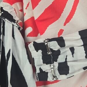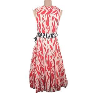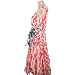 Diane Von Furstenberg Y2K 2006 Collection red and white print wrap dress with black and white print attached belt. Full lined, bubble hem. Belt has metal hook closures. Very good preowned condition, Size: 6