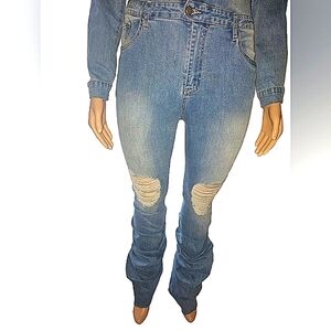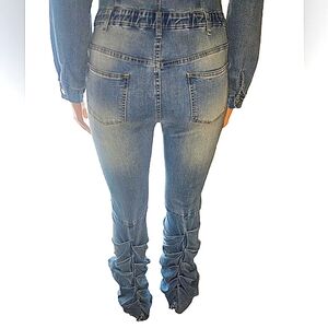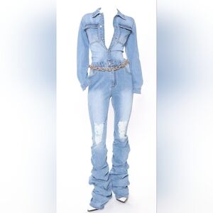 like new excellent condition, Megan The Stallion for Fashion Nova, tall, light wash denim, scrunch leg jumpsuit. L