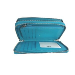 Keywords: Coach Wallet, Double Zip, Crossgrain Leather, Turquoise, Teal, Blue, Organizer, Wristlet, Designer Wallet, Luxury Accessory, Bright, Pop of Color, Travel Wallet, ID Window, Silver Hardware