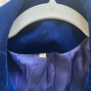 Luxurious blue velvet coat and pants set. Features Great condition. From an online boutique I don’t remember. worn once. Best for size 0 or 2.