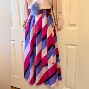 New! 2 side pockets, flowing fabric, step into with stretch waist, Eye-catching A-line skirt with bold pink and purple stripes. Ideal for a chic and colorful look.