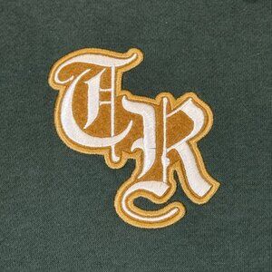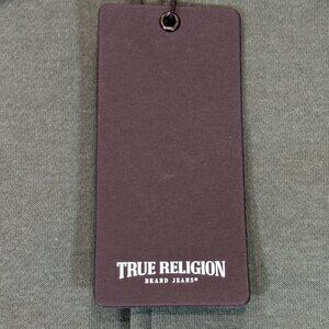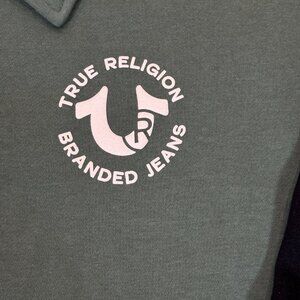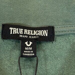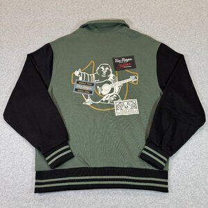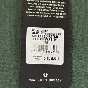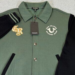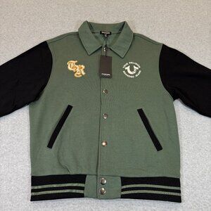 True Religion Men's Collared Patch Fleece Varsity Jacket Medium Green Black NWT