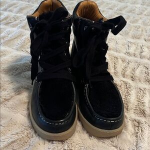 Chic black knit vest with a front zipper. Features a textured design and button accents.