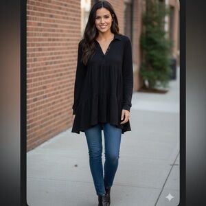 Chic black dress with long sleeves. Features a tiered design. Perfect for versatile styling. NWOT. Size XS