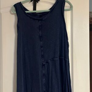 Chic navy dress with a high low hem. Sleeveless design for versatile wear.