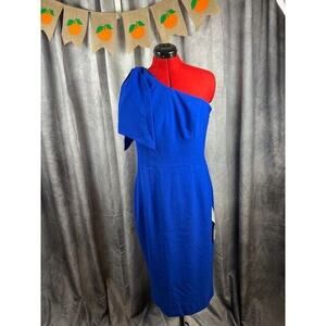DRESS THE POPULATION Tiffany One-Shoulder Bow-Tie Midi Dress in Blue Size L NWT