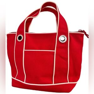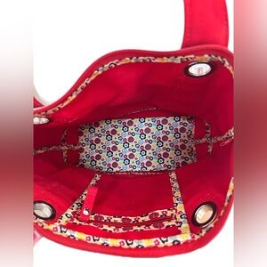 Crafted from durable red canvas, this tote features bold silver grommet accents that add a touch of modern flair, while the interior reveals Vera Bradley’s signature bright and cheerful floral pattern—a delightful surprise that reflects the brand’s joyful spirit.