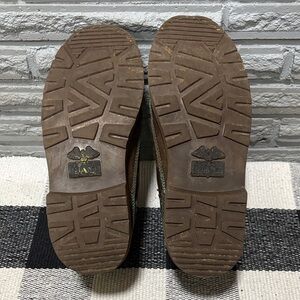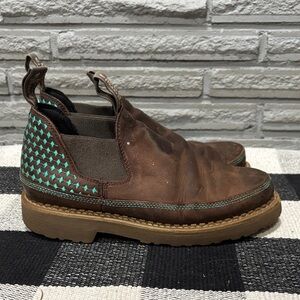 Durable brown leather boots with teal accents. Slip-on design for easy wear. Ideal for everyday use. They have only been worn a handful of times and still have a lot of life left. The right shoe shows some small drops of paint and a scuff on the toe, please see all pictures for the condition.