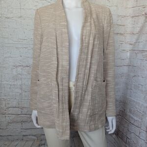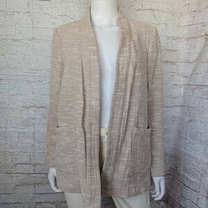Eileen Fisher Rhythmic Cotton Slub Kimono Jacket in a natural beige color. This open-front jacket features a textured "slub" weave, two front patch pockets, and a relaxed, kimono-style silhouette.