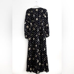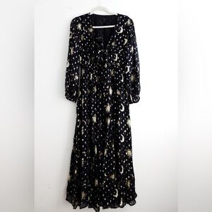 Elegant long sleeve dress. Features celestial print. Perfect for evening wear.