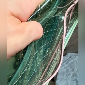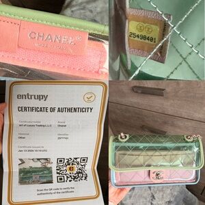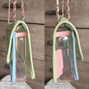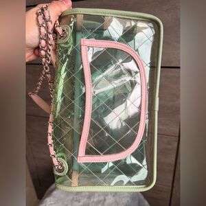 💚The PVC exterior is perfect to use as a concert/stadium bag or to rotate as your summer bag! Features pink, green and blue leather accents with chain strap that can be doubled to wear shoulder carry or crossbody carry. Silver tone accents and CC twist lock closure! Hologram intact. Very good condition with light signs of use