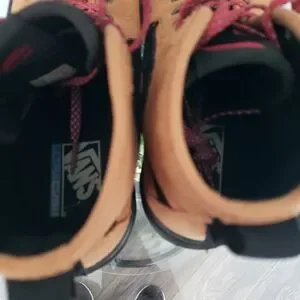 Vans hiker sk8 hi suede high top shoes brown and black with red laces.