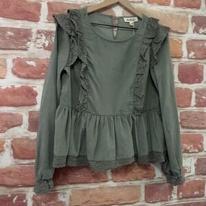 Listicle Top Womens Medium Green Boho Embroidered Crochet Worn Look Casual Shirt