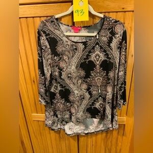 Chic paisley blouse with intricate patterns. Features a stylish black and gray design. Ideal for versatile wear.