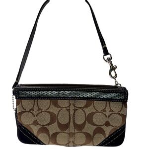The item in the image is a Coach Signature Beaded Wristlet. It is in Good used Condition. It is clean and ready to use. Corners are good. Nothing to note. Please look at pictures as they are part of the descriptions.