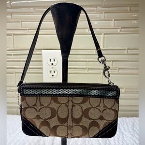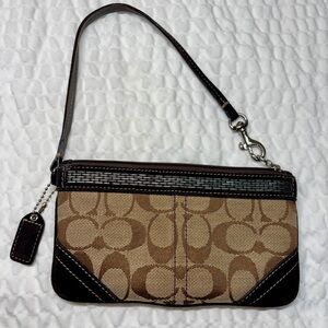 Design: The wristlet features the iconic Coach signature brown jacquard canvas pattern plus a beaded top strip along the front of the bag. The back part of the strap is silver to match the beads.