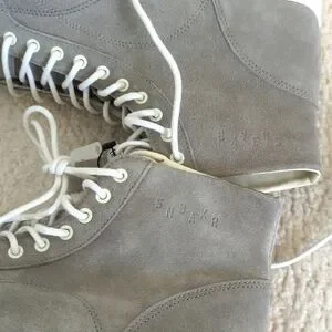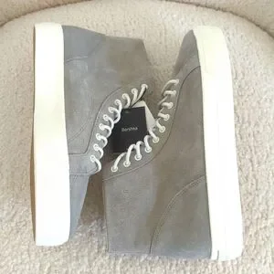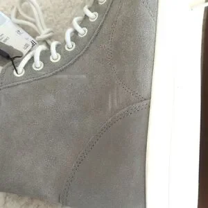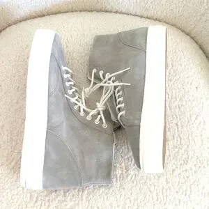 Stylish gray high-top sneakers. Features white laces and soles. Perfect for casual wear. New with tags.