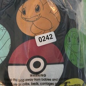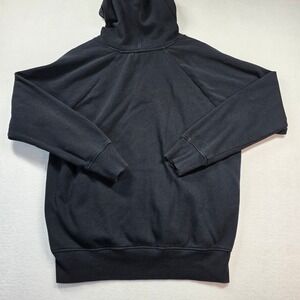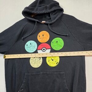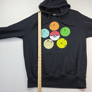 Pre-owned black Pokémon pullover hoodie in size Medium featuring a colorful Poké Ball + character circle graphic (Pikachu, Squirtle, Bulbasaur, Charmander, Meowth). Soft midweight fleece feel with drawstring hood and front pouch pocket. Great gamer/anime streetwear piece.