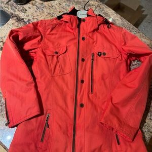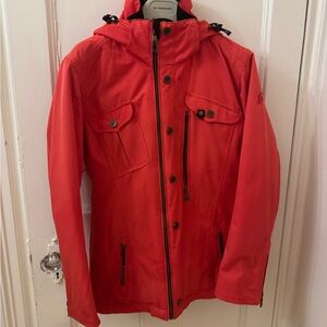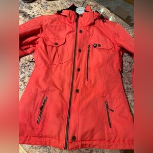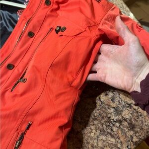 Vibrant red warm winter jacket from Obermeyer, excellent used condition: no rips, stains, snags or notable signs of wear. well Insulated, *amazing pockets both inside and out, including a special pocket with attached cleaning cloth for sunglasses or ski goggles, and special zippered under-arm vents to keep you cool or regulate your temperature. Detachable hood, interior snow skirt, hits low on the hips to keep your bum warm and prevent drafts. Beautiful jacket in a bright red!- grab this amazing find before it’s gone!