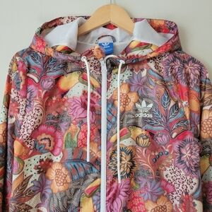 Adidas X Farm Rio Fugiprabali Women's Hooded Track Jacket Size Small - Longline hooded track jacket - tropical Farm Rio print features toucans and fruit - Size and care tags removed, so listing size is an estimate (check measurements to ensure fit) Approx flat measurements- pit to pit 19", waist 19.5", shoulders 16", length 28" Good used condition- note the drawstring from the hem is missing