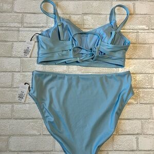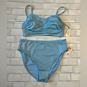 Chic light blue bikini set. Features a ruched top and high-waisted bottoms. Perfect for a stylish beach look.