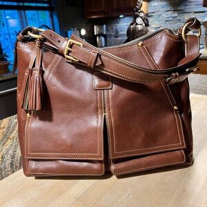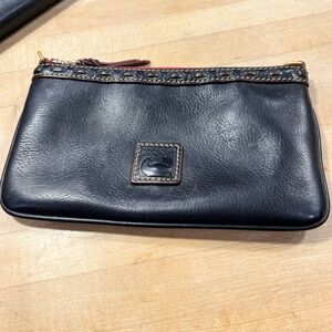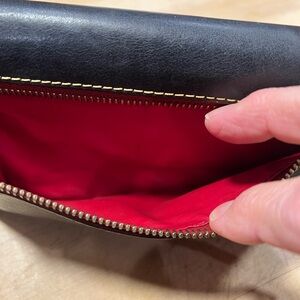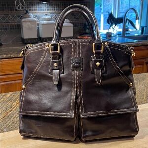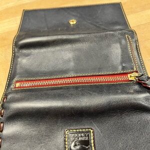 Beautiful Navy Blue Dooney and Bourke Florentine Satchel with wallet and cosmetic bag and matching strap. An outstanding set. Perfect condition inside and out on all three items. Handbag is new without tags. Pretty navy leather with reddish highlights and brown lacing make this bag stand out. Wallet is in excellent barely used condition and wristlet is like new but does not have strap. Bag is 14” long 9” tall 6” deep. Wallet is 7.5” wide 4” tall 1” deep. Wristlet is 8.25” long 5” tall .75” deep. A beautiful set. No tears, odors rips or stains. Smoke free home. $ 350.00 set