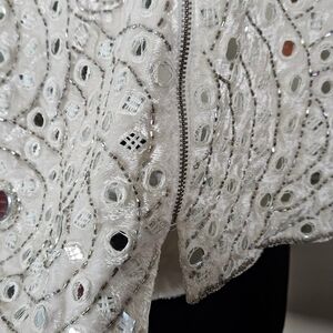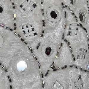 White velvet background with mirror mosaics, beads throughout.
