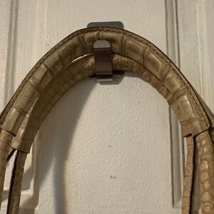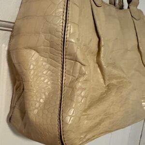 This stylish tan bag features a sophisticated crocodile-embossed design. Perfect for any occasion, it combines elegance with practicality. 14 inches wide by 8 inches high. inside of bag needs cleaning and outside has minor tattering in spot pointed to to in pics not noticeable to average human eyes but still a great bag at an crazy affordable price