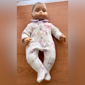 • The doll in the image is wearing its original floral pajamas with a lavender collar.