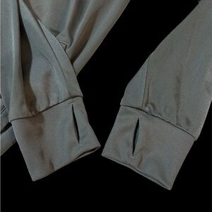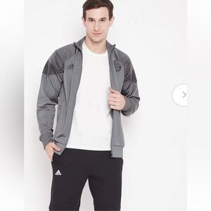Stylish gray track jacket. Features full-zip closure. Adidas logo on chest. Comfortable and sleek design.