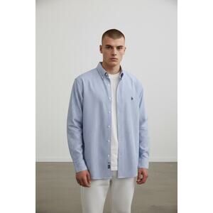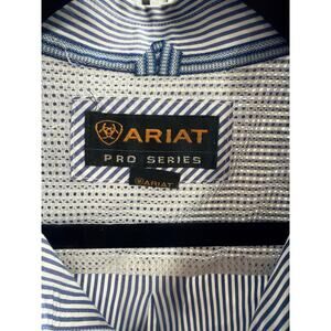 Ariat Pro Series striped button down shirt in blue and white. Classic western inspired performance shirt with breathable mesh lining at upper back and embroidered Ariat logo on chest.