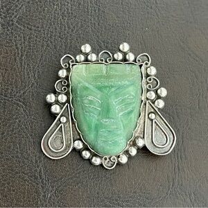 Vintage Mexican 900 silver carved jade warrior head brooch