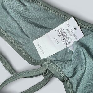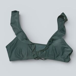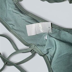 Aerie sage green bikini top featuring soft ruffle straps and a flattering scoop neckline. Strappy tie-back detail for an adjustable fit. Smooth, stretchy swim fabric with removable padding for customizable support.