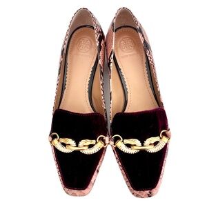 Tory Burch ‘Jessa’ Burgundy Velvet and Pink Snakeskin Embossed Loafers, Size 6.5