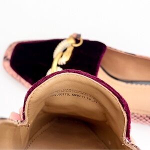 Gently preowned Tory Burch ‘Jessa’ burgundy velvet and pink snakeskin embossed leather loafers.
