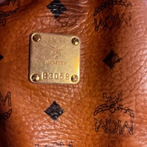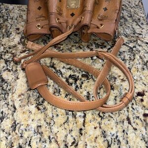 Final markdown - GUC Authentic Vintage MCM Heritage Visetos monogram drawstring bucket crossbody. Inside has a zippered pocket. Long adjustable strap. Back of bag has discoloration. Hardware on strap metal is tarnished. This is a vintage bag. Price drop firm price