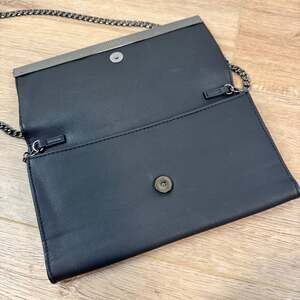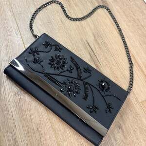 Simply Vera Vera Wang Black Beaded Floral Clutch, One Size. This elegant evening bag features intricate black beaded floral embroidery on a soft black faux-leather exterior. It includes a gunmetal-tone chain crossbody strap that can be tucked inside to use as a handheld clutch. Designed with a sleek metal bar accent and a secure magnetic snap closure. Perfect for weddings, formal events, or a night out. Excellent pre-owned condition with all beads intact. Minimal signs of wear on hardware.