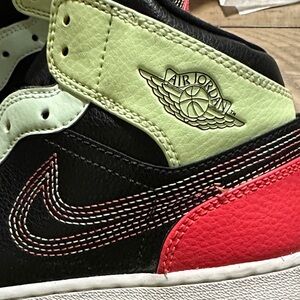 Vibrant Jordan sneakers for kids. Black base with pink and green highlights. High-top design for style and support. Glow in the dark in good condition. No shoe laces. Clean. Size 6.5Y