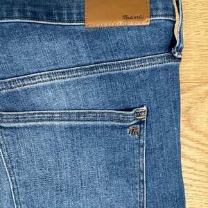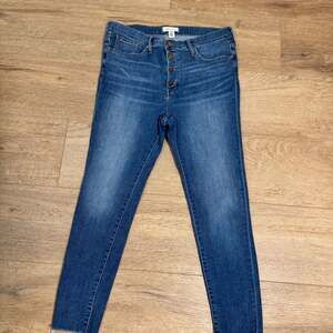 Madewell 9" Mid-Rise Skinny Jeans in a classic blue wash, size 32. These jeans feature a stylish exposed button-front fly and a modern raw hem for a laid-back, lived-in look.