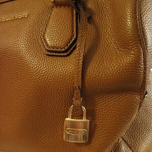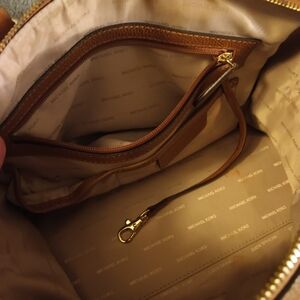 Michael Kors Brown/tan Leather Satchel. Comes with Michael Kors dust bag. Top handles, adjustable crossbody strap. Outside hanging MK tag with logo. Top zipper closure on top of bag that zips perfectly. Bottom feet metal for protection. Both sides on outer sides have magnetic snap closure. Inside has hanging key strap, zipper compartment, and 4 slots. Clean bag with only a small spot inside I would say. Measures approximately 12.5L, 9H, 7D. Please see pics