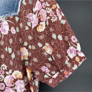 Free People Women's Boho Floral Denim Trim Mini Dress 6 Brown Mixed Media Y2k