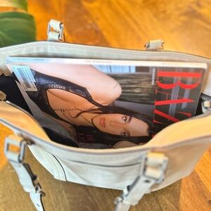 Elevate your style with the Coach Beige Leather Tote Bag. This elegant bag features a sophisticated beige color, perfect for any occasion. Crafted with high-quality leather, it offers both durability and timeless style. Ideal for everyday use, this tote bag combines functionality with luxury. Bag charm and scarf not for sale. Used for lifestyle images only.