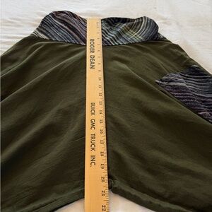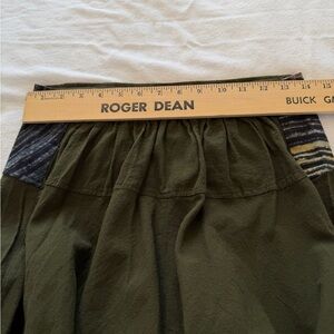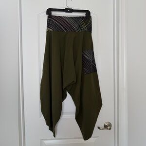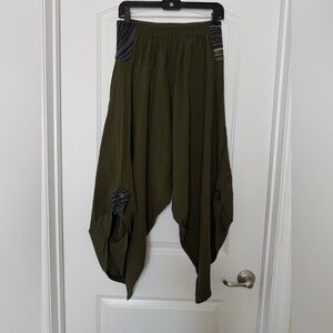 Embrace a sense of effortless wanderlust with these artisanal drop-crotch harem pants. Drenched in a rich, mossy olive hue, these trousers are crafted for the modern nomad who values both comfort and a unique aesthetic . The high-rise waistband and a single statement pocket feature an intricate, hill-tribe inspired motif, adding a touch of ancestral charm to the minimalist design 021226F2