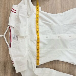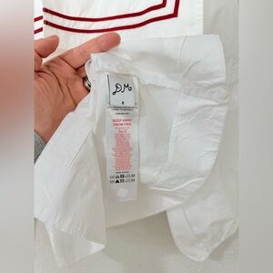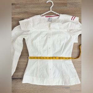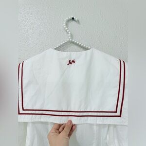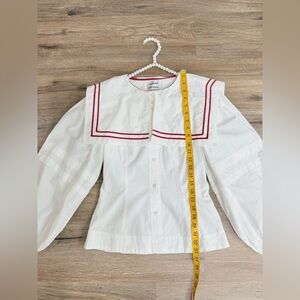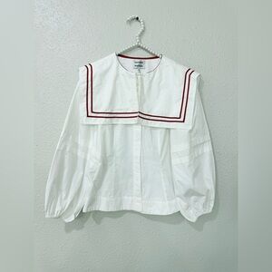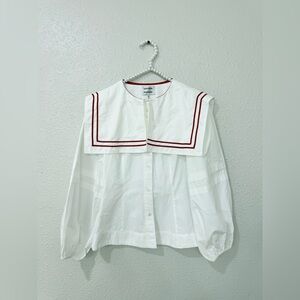 Elegant white blouse featuring a distinctive sailor collar with red accents. Perfect for a chic and stylish look.
