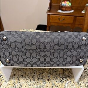 Elegant Coach satchel with iconic pattern. Black leather trim. Perfect for everyday use.